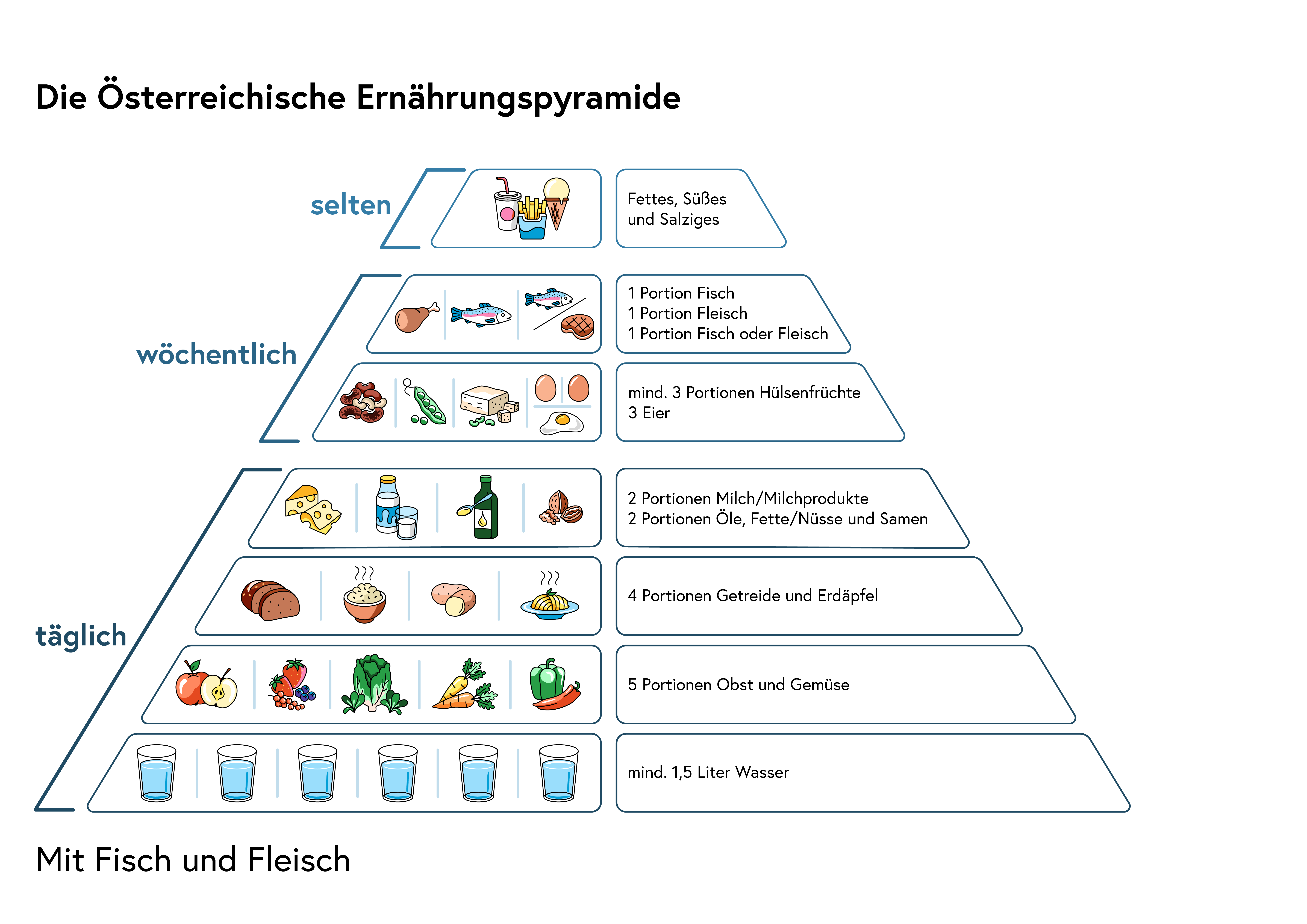 Die steirische Ernährungspyramide bildet derzeit die österreichischen Ernährungsempfehlungen ab, wie sie bis Mai 2024 galten.