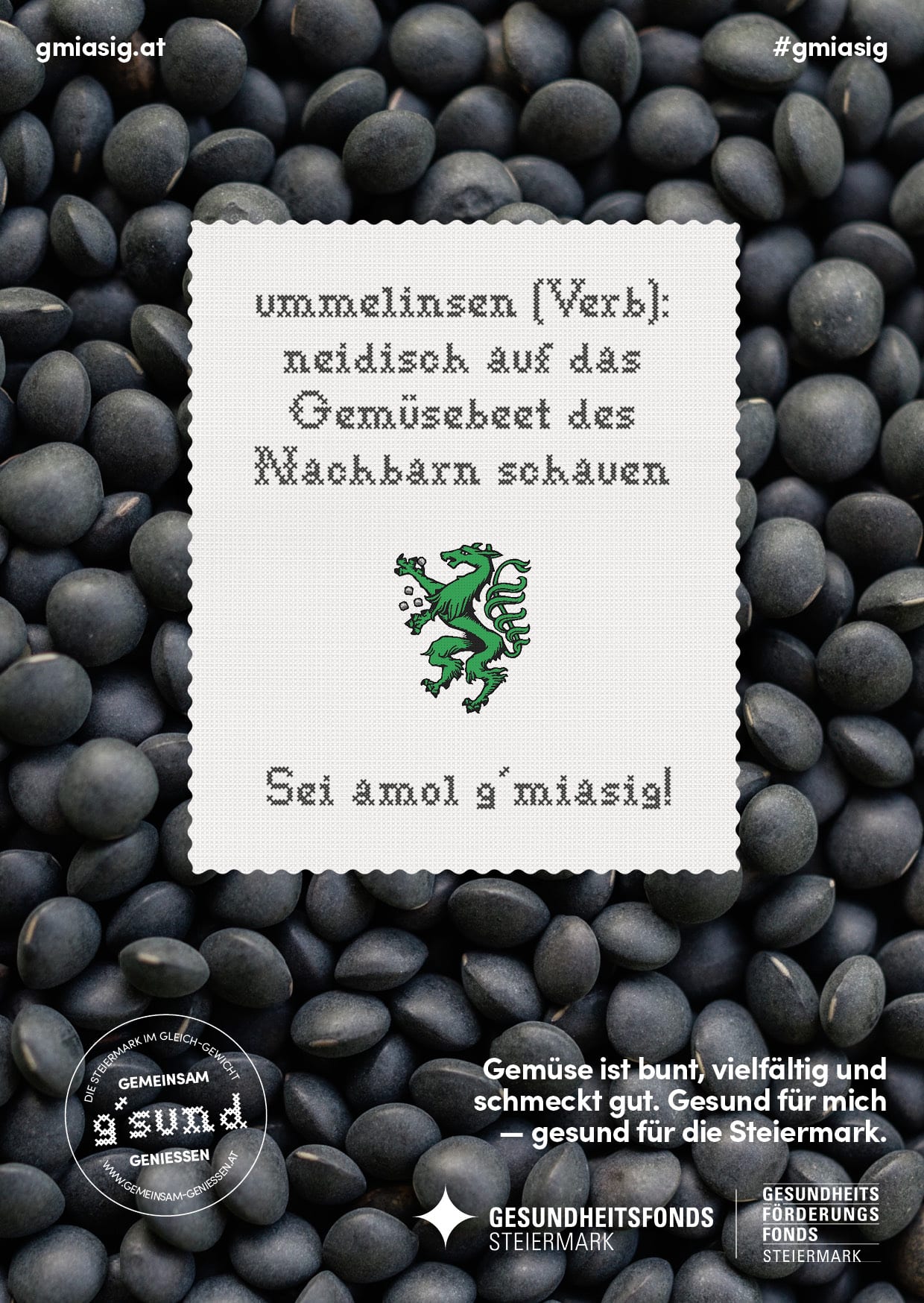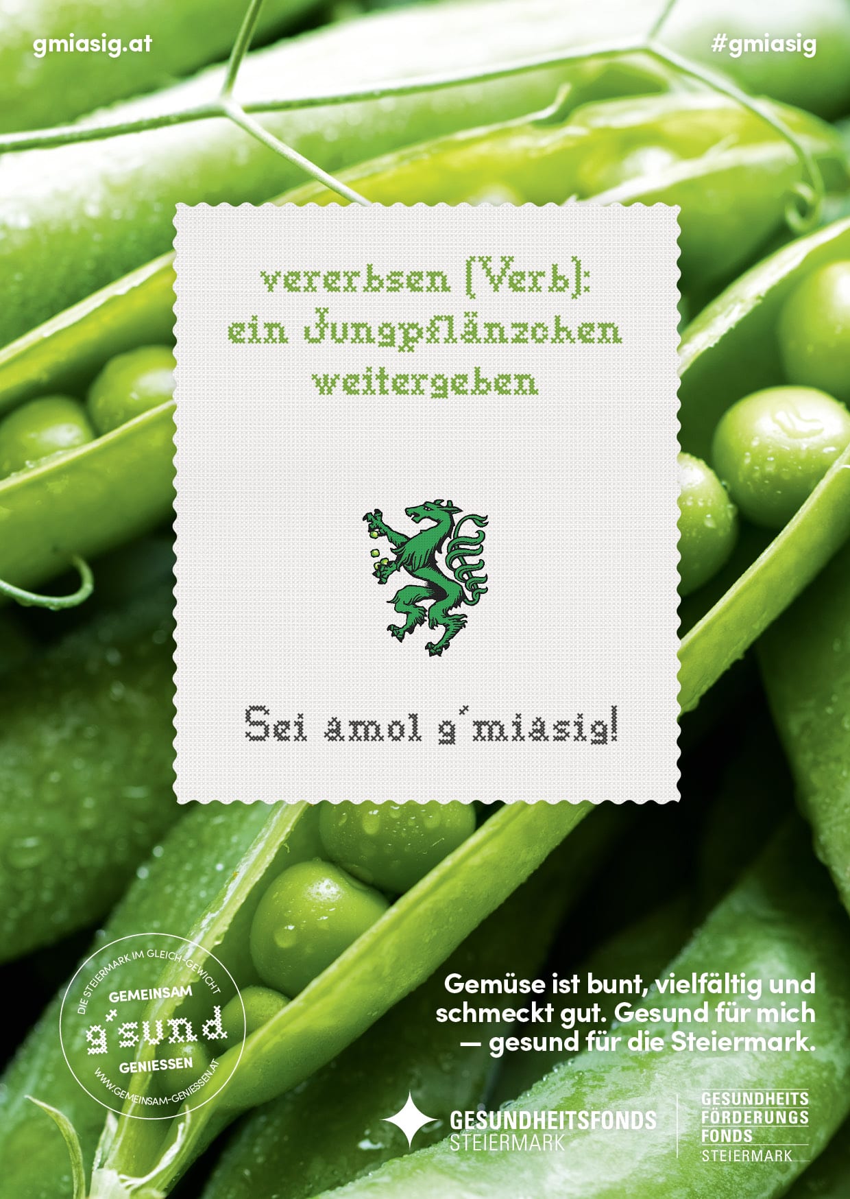 Wir wollen mit einem  lustvollen Ansatz vermitteln, dass Gemüse gut tut, gut schmeckt und – kurz gesagt – das Essen besser macht. Deshalb gibt es  von uns auch ein besonderes  Vokabular (Sujets), das das Thema Gemüse einmal anders thematisiert. Zellern wir doch die Steiermark gemeinsam an, mehr Gemüse einezuwoazn :-).