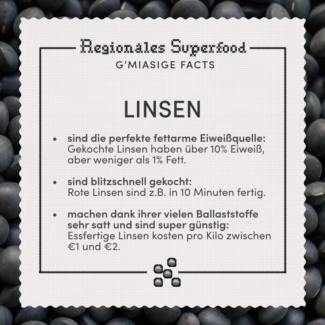 • Nutzen Sie aber auch z. B. Rote Linsen für Ihre schnelle Küche. Sie sind schon geschält und deshalb unschlagbar in der Zubereitungszeit. Es dauert nur 10–15 Minuten, bis sie gar sind.