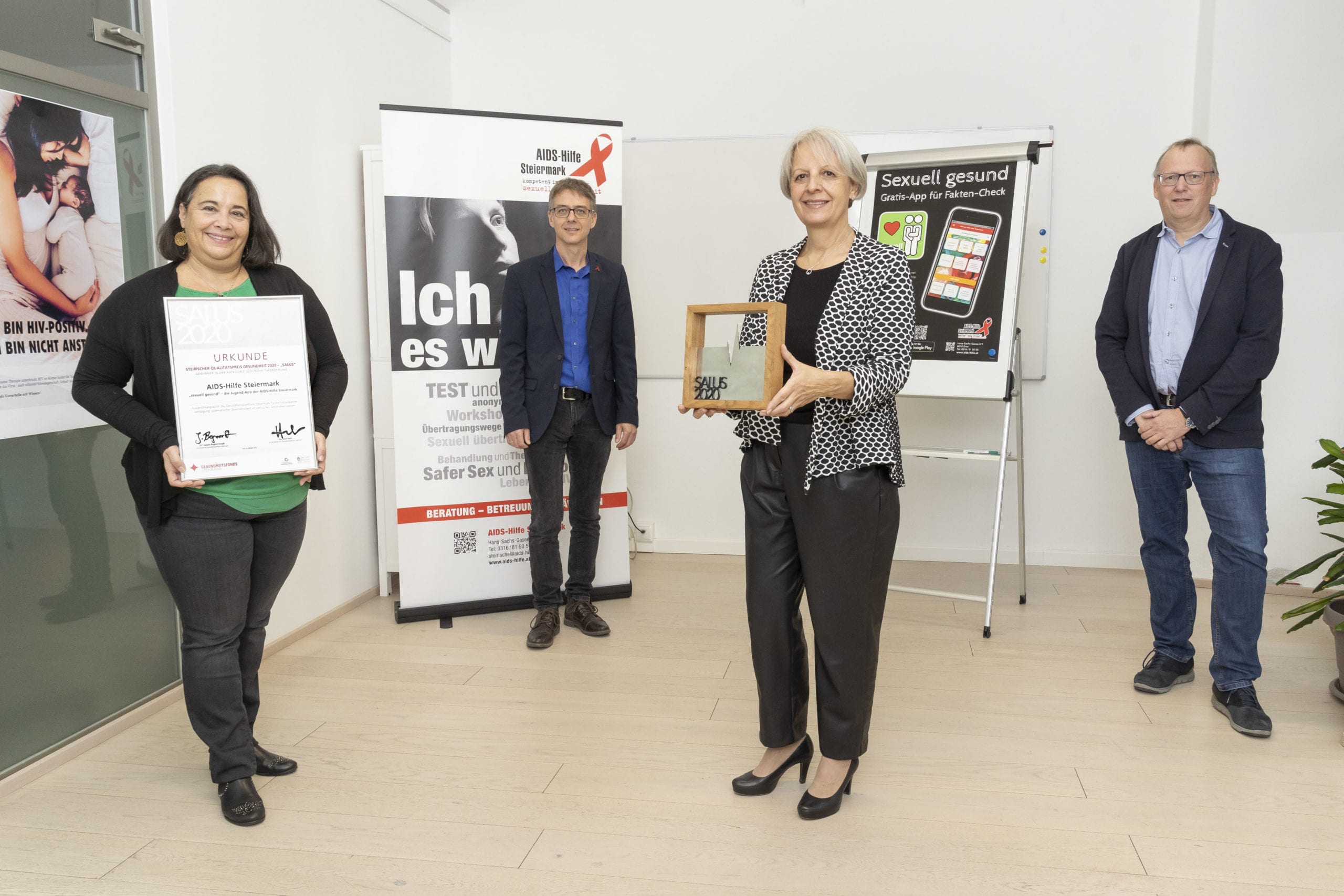 v.l.n.r.: VertreterInnen der „SALUS“-Gewinner 2020 Projekt „sexuell gesund“ der AIDS-Hilfe Steiermark: Eva Fellner; Manfred Rupp, Flora Hutz und Geschäftsführer des Gesundheitsfonds Michael Koren