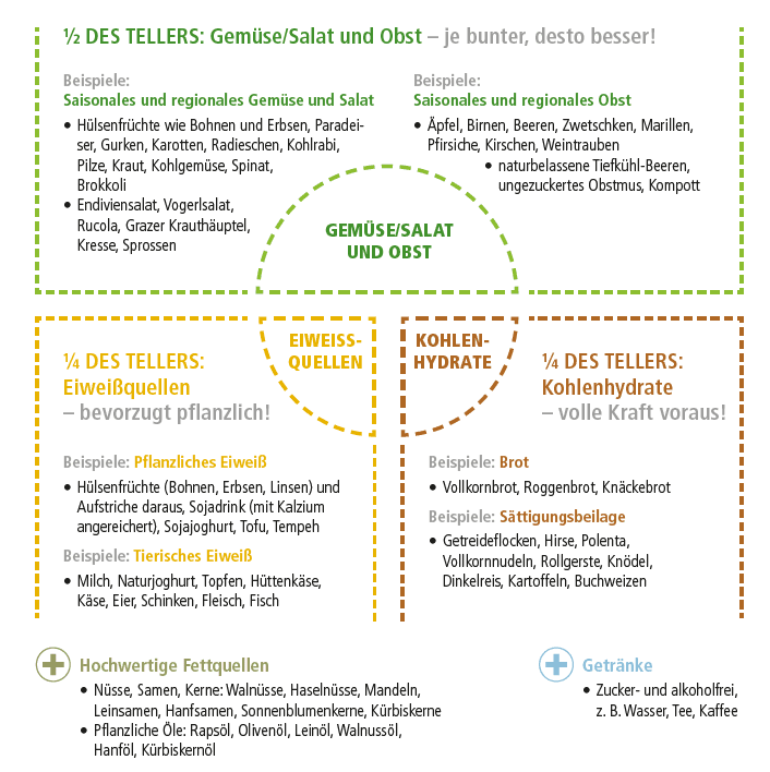 Das österreichische “Tellermodell“ zeigt die optimale Zusammenstellung einer Mahlzeit.