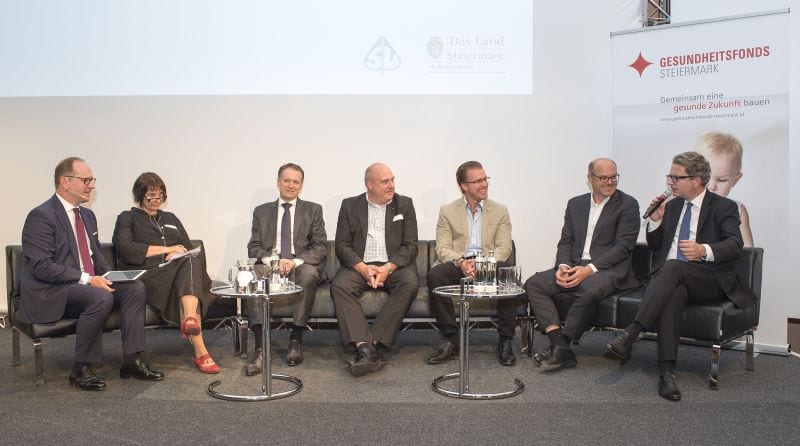 Bildtext: v.l.n.r.: Moderator Gerald Gross, Patientenombudsfrau Renate Skledar, Ärztekammerpräsident Herwig Linder, Geschäftsführer Notruf Niederösterreich Christof Chwojka, Landtagsabgeordneter Oliver Wieser, StGKK-Obmann Josef Harb, Gesundheitslandesrat Christopher Drexler. (© Gesundheitsfonds Steiermark/Hutter)